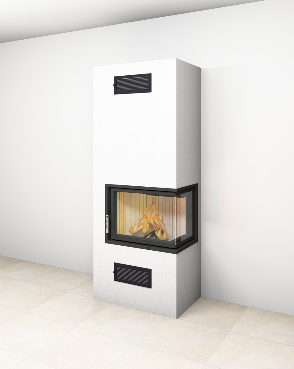 Kamin s kotno zasteklitvijo v velikosti 45 x 75 x 40 cm in stranskim odpiranjem.